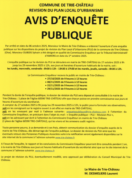 Le PLU est un document d'urbanisme qui détermine un projet d'urbanisme au plan communal. Il remplace le Plan d'Occupation des Sols (POS) depuis la loi relative à la Solidarité et au Renouvellement Urbain du 13 décembre 2000 dite loi SRU. Bien qu'antérieur au Scot de la Communauté de commune du Vexin-Thelle, le PLU de Trie-Château doit s'y conformer d'où l'obligation d'effectuer une révision qui doit être lancée dès 2017.